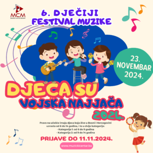 - JAVNI POZIV: 6. DJEČIJI FESTIVAL MUZIKEJ A V N I P O Z I V6. DJEČIJI FESTIVAL „DJECA SU VOJSKA NAJJAČA“ 2024 Muzički centar Mozart raspisuje javni poziv za učešće na 6. Dječiji festival muzike „Djeca su… Read more: JAVNI POZIV: 6. DJEČIJI FESTIVAL MUZIKE